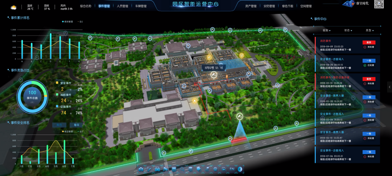 实时监测园区内各类安全事件的发生,通过园区的物联网设备的报警与安保人员的事件上报,启动园区相应的安全灾害预警方案,使管理者在第一时间内判断事件发展态势,启动各项应急措施,调动应急资源,疏散人群,做好应对园区各类突发事件的应急处理工作。